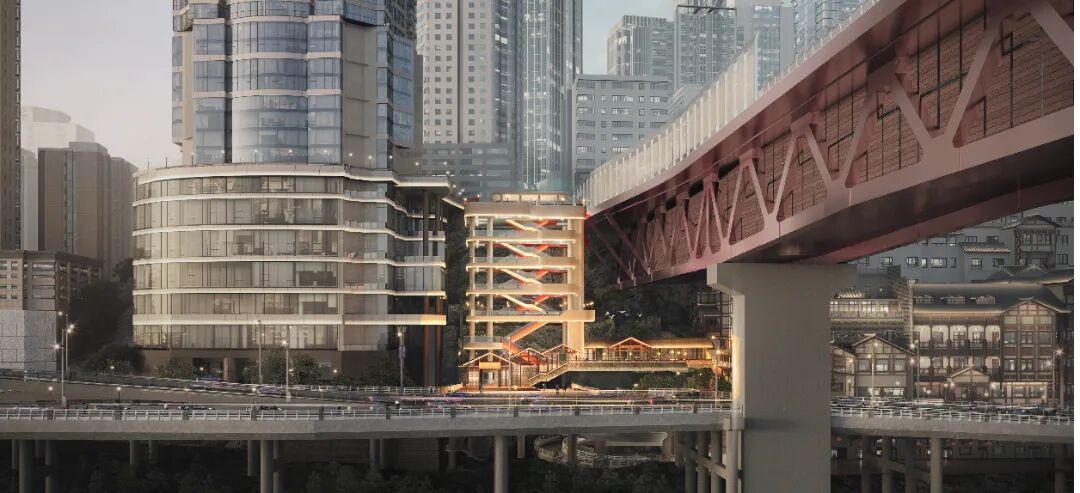 连通立体城市,破解“行路难”。项目巧妙地在约40米的垂直高差间建立了连接,上接沧白路、城市阳台和千厮门大桥,下通嘉滨路和滨江步道。未来,市民游客从千厮门大桥到江边可以实现步行直达,充分体验立体山城的魅力。