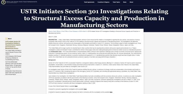 美方称,此次调查内容涉及制造业领域结构性产能过剩与过度生产的问题,有三大评估指标:持续的贸易顺差、对美双边贸易顺差以及闲置或未充分利用的生产产能。此次调查将判定某些行为、政策与措施是否构成不合理或具歧视性的做法,是否对美国商业造成负担或限制。